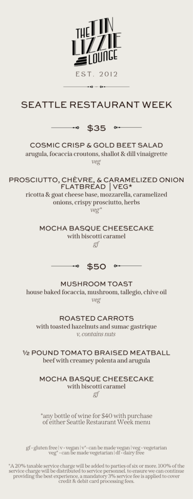 Join us at Tin Lizzie for Seattle Restaurant Week, April 19th – May 2nd!